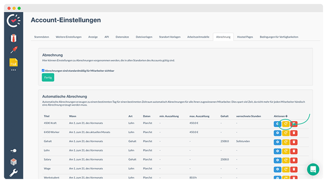 Wenn Änderungen an Lohnarten oder Abrechnungs-Einstellungen vorgenommen wurden, kannst Du die automatische Abrechnung neu generieren, um korrekte Abrechnungen zu erhalten. Im Unterschied zur manuellen Neuberechnung einer einzelnen Abrechnung (siehe manuelle Abrechnung erstellen) wird bei der erneuten Erstellung der automatischen Abrechnung die bestehende Abrechnung vollständig gelöscht und neu erstellt.