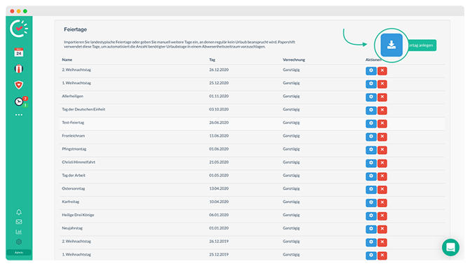 Im Abschnitt „Feiertage“ klicke auf den grünen Button „Feiertag anlegen“.