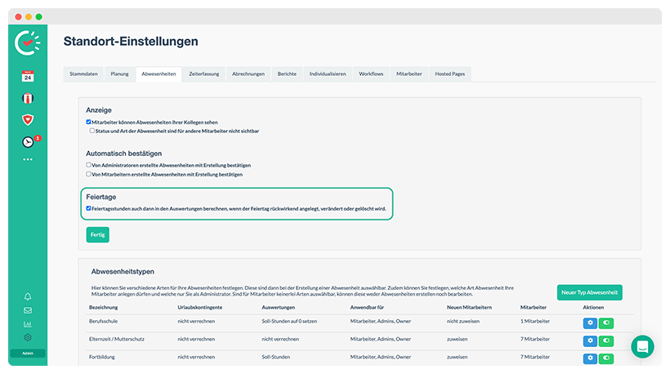 In den Standort-Einstellungen, im Reiter „Abwesenheiten“, gibt es eine Option, um sicherzustellen, dass nachträglich erstellte Feiertage korrekt berücksichtigt und verrechnet werden. Setze hier den Haken und bestätige mit „Fertig“.