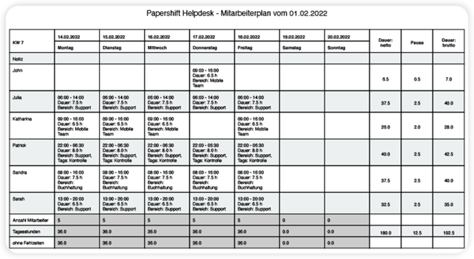 Format: Jede Abteilung oder jeder Arbeitsbereich erhält einen eigenen Abschnitt, sodass Mitarbeiter ihre Schichten schnell finden können.