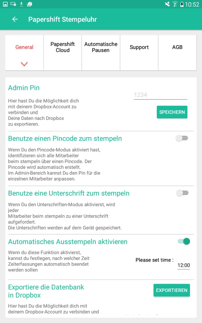 Einstellungen vornehmen: Aktiviere den Regler bei „Automatisch Ausstempeln aktivieren“.