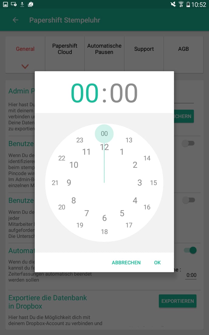 Die eingestellte Zeit gilt einheitlich für alle Mitarbeiter. Die App berechnet die Beendigungszeit basierend auf der Startzeit der Zeiterfassung.