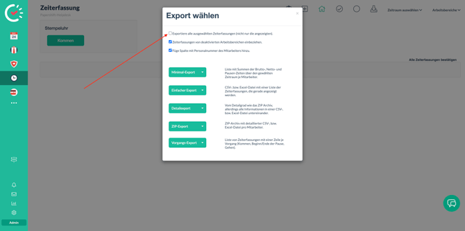 Wähle anschließend aus, ob Du alle Zeiterfassungen oder nur die angezeigten Zeiterfassungen exportieren möchtest.