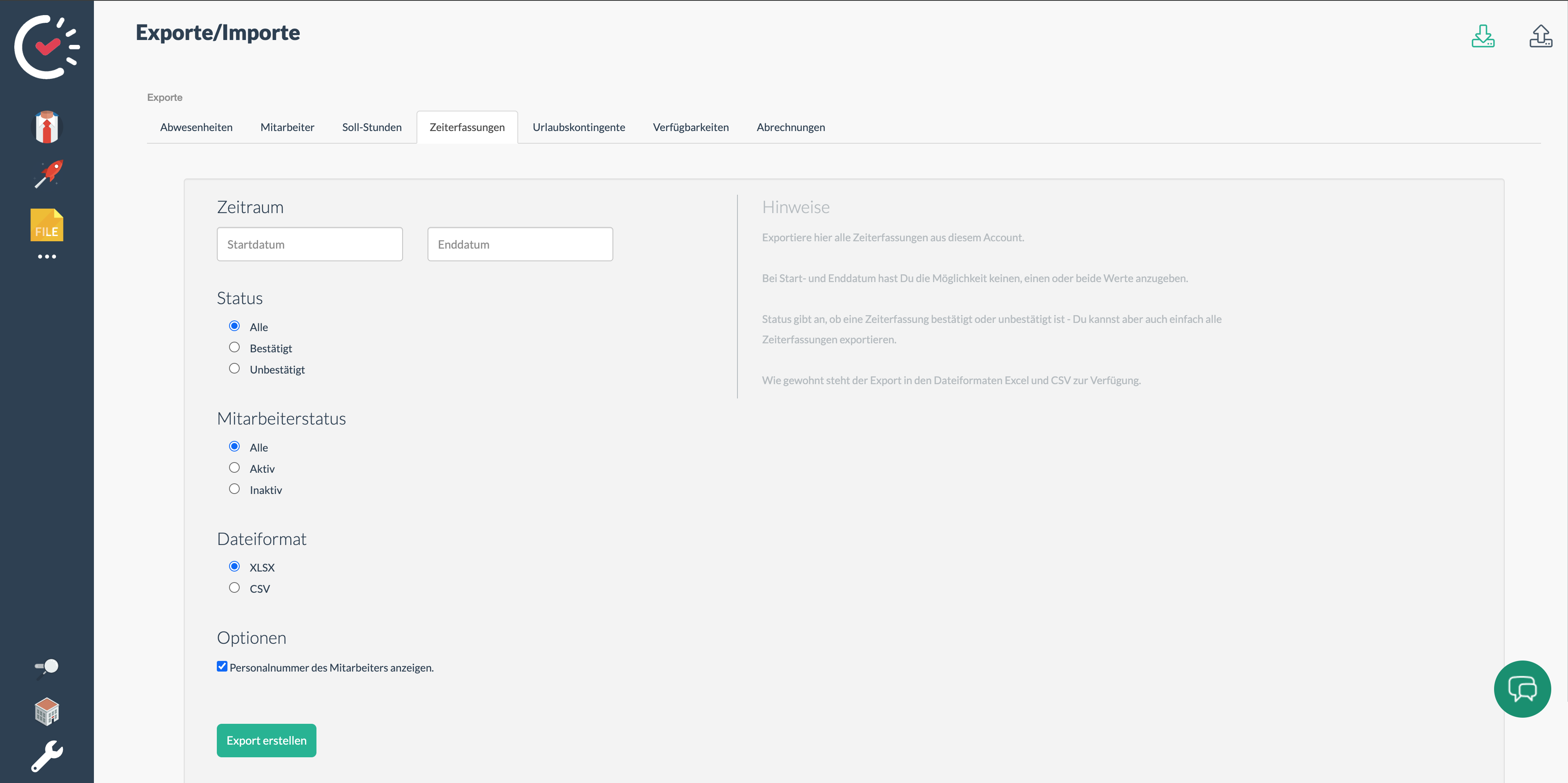 Wähle den Zeitraum und den Status der Zeiterfassungen aus, die Du exportieren möchtest.