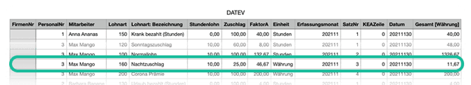 Ein DATEV-Export für alle Mitarbeiter zeigt eine Zeile pro Lohnart pro Mitarbeiter und Monat.