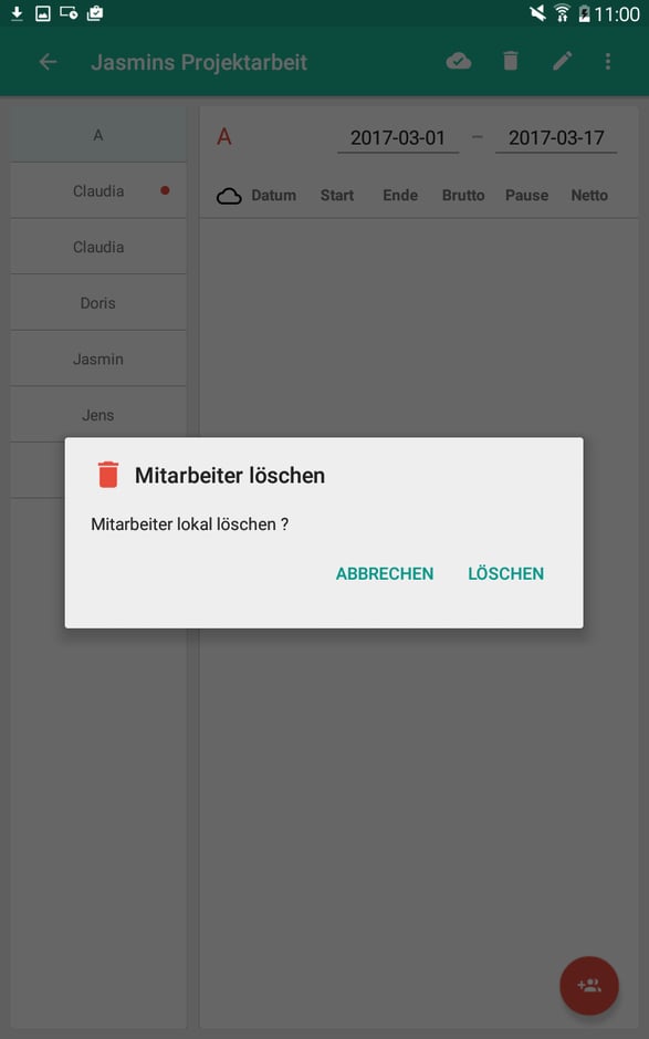 Mitarbeiter löschen: Anschließend auf das Mülleimer-Symbol (Tonne) klicken. Bestätige die Meldung mit “Löschen”, um den Mitarbeiter endgültig aus der App zu entfernen.